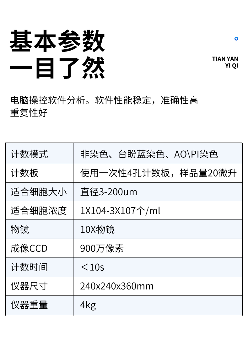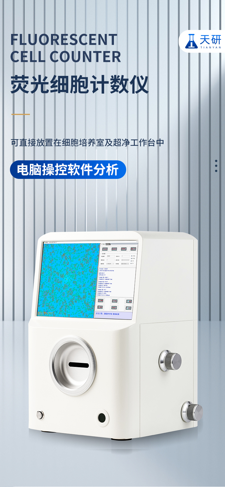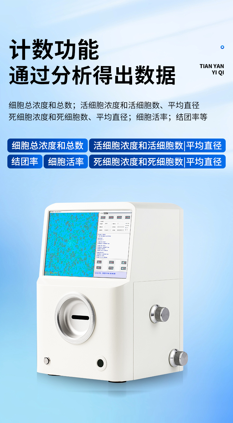 该细胞计数仪采用自主研发的细胞成像技术结合传统血球计数原理,通过计数软件实现细胞图像自动计数、活力分析,并绘制细胞大小柱状图;仪器可直接放置在细胞培养室及超净工作台中,支持电脑操控软件分析,软件性能稳定、准确性高、重复性好。