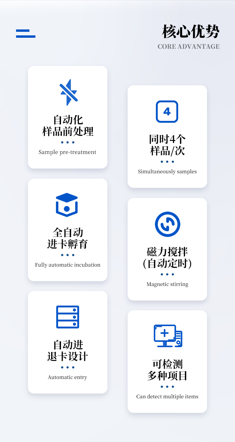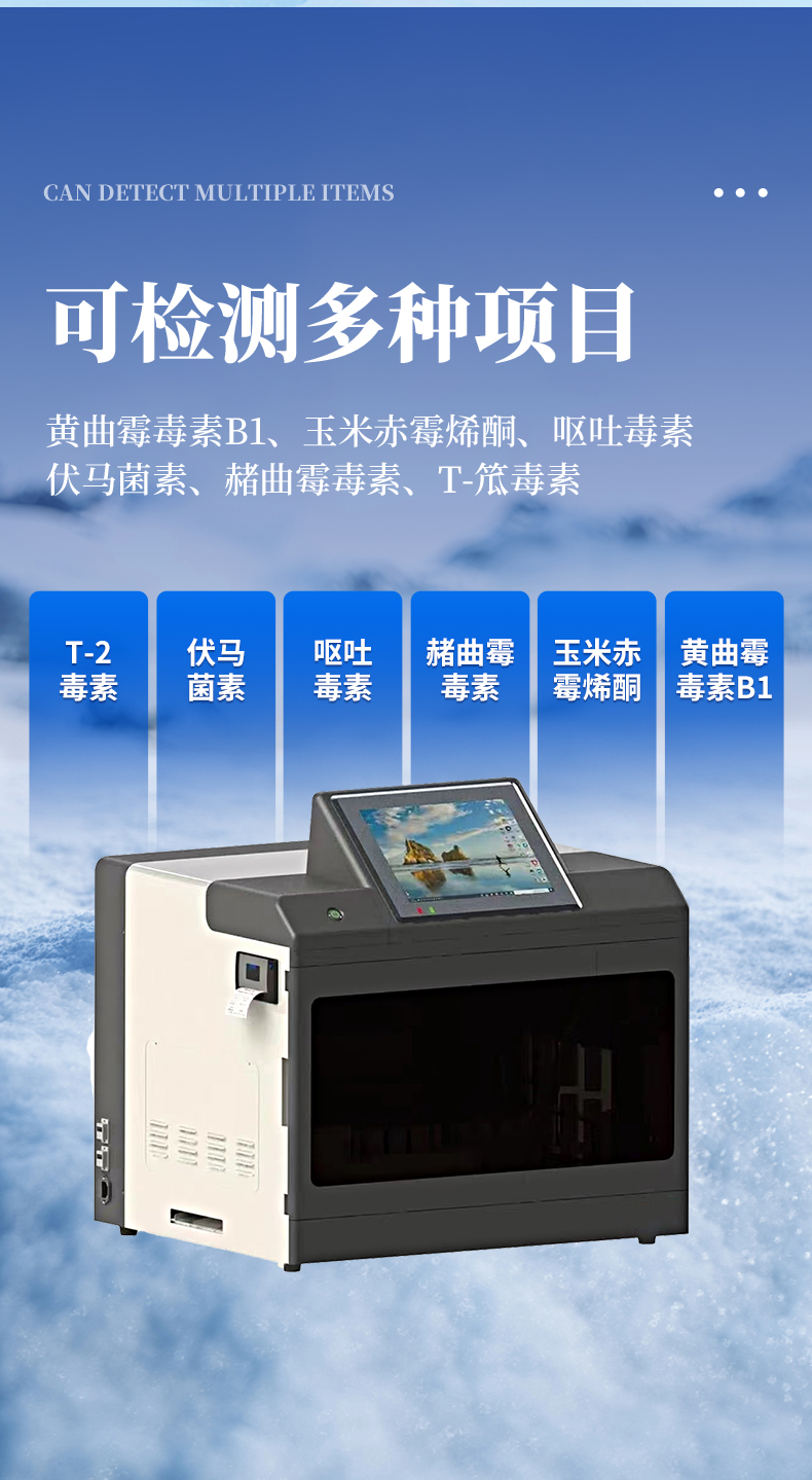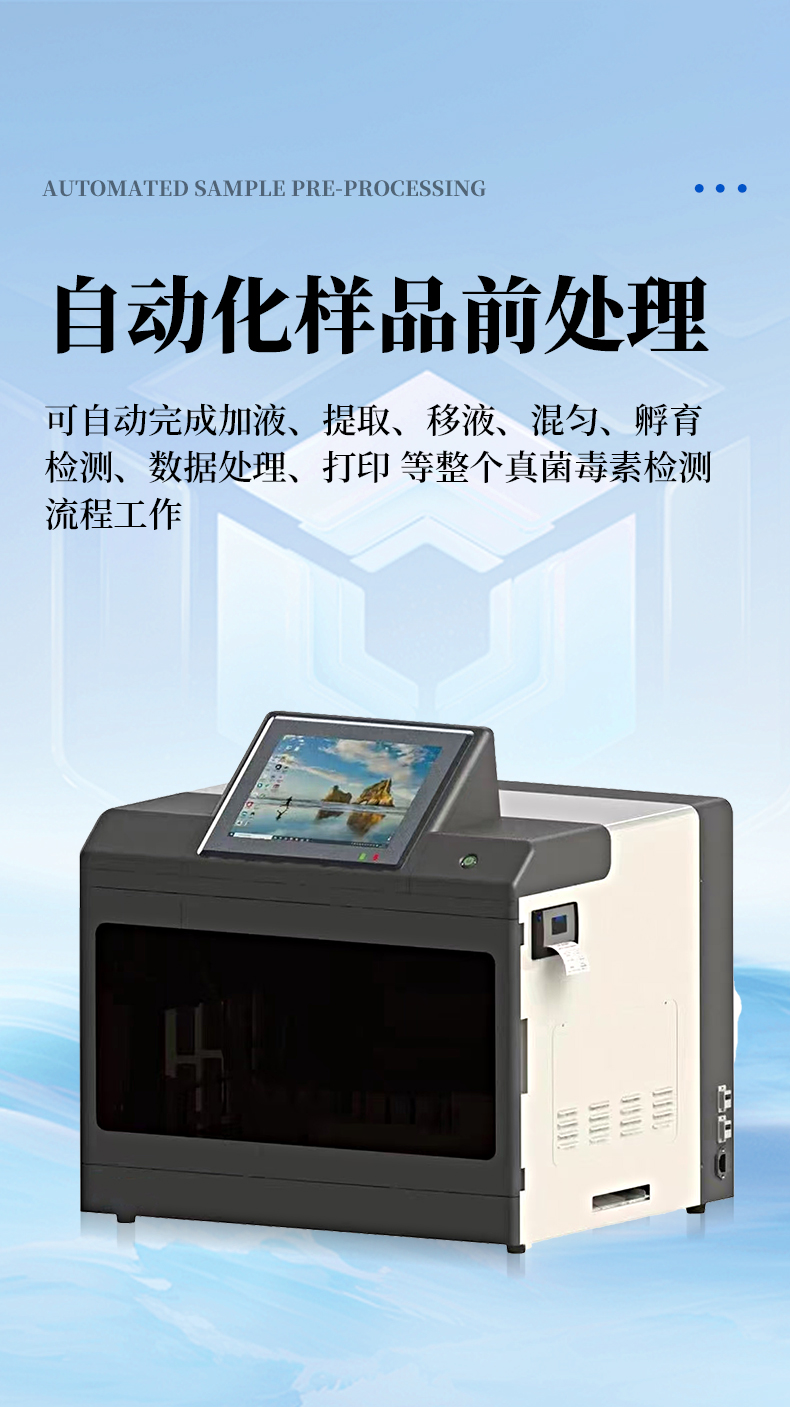 本产品是以真菌毒素分析前处理技术开发的全自动检测仪,可自动完成提取、混匀、移液、孵育、检测、数据处理、打印等全流程工作。该仪器基于光电检测原理的免疫荧光检测技术,配套专用荧光免疫试剂,通过自动化样品前处理替代人工操作,可检测黄曲霉B1、呕吐毒素等多种真菌毒素,实用性强、操作方便,能节省大量人力物力时间成本,适用于粮油质检、粮库收储、饲料企业、食品加工、第三方检测、政府监管等单位。