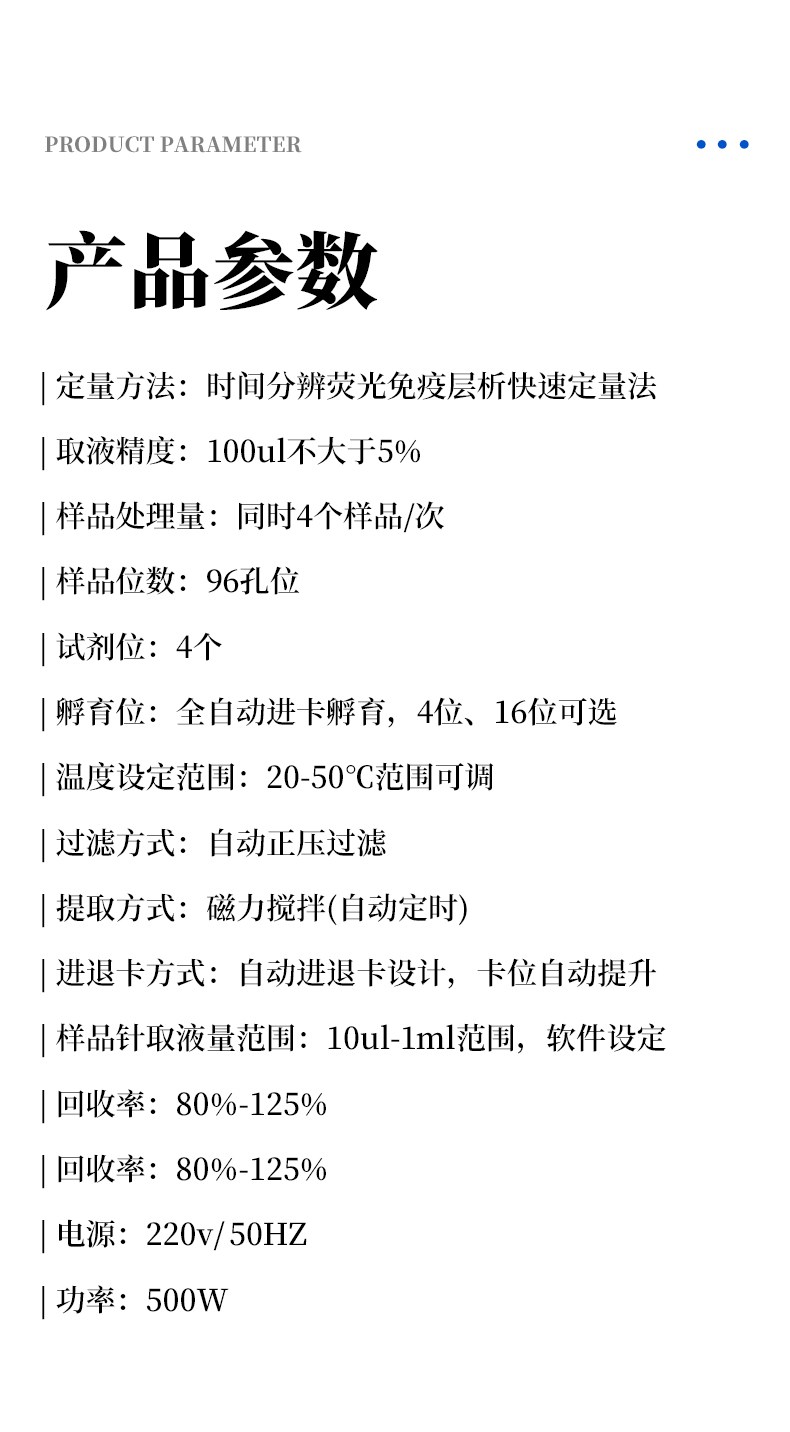 | 5、样品位数:96孔位; | 6、试剂位:4个; | 7、孵育位:全自动进卡孵育,4位、16位可选; | 8、温度设定范围:20-50℃范围可调; |