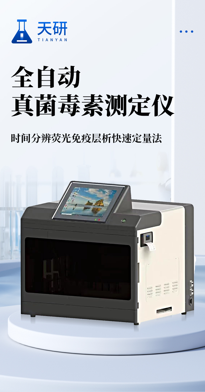 全自动真菌毒素检测仪简述: 本产品是以真菌毒素分析前处理技术开发的全自动检测仪,可自动完成提取、混匀、移液、孵育、检测、数据处理、打印等全流程工作。该仪器基于光电检测原理的免疫荧光检测技术,配套专用荧光免疫试剂,通过自动化样品前处理替代人工操作,可检测黄曲霉B1、呕吐毒素等多种