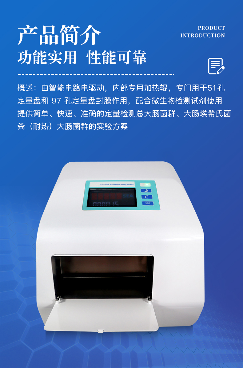 程控定量封口机简述: 程控定量封口机由智能电路电驱动,内部专用加热辊,专门用于51孔定量盘和97孔定量盘封膜作用,配合微生物检测试剂使用,提供简单、快速、准确的定量检测总大肠菌群、大肠埃希氏菌、粪(耐热)大肠菌群、肠球菌和绿脓假单胞菌的实验方案;51孔定量盘和97孔定量盘是基于传统方法最大可能