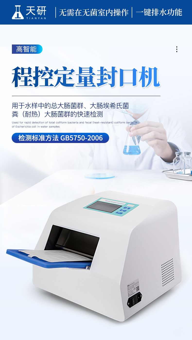 程控定量封口机由智能电路电驱动,内部专用加热辊,专门用于51孔定量盘和97孔定量盘封膜作用,配合微生物检测试剂使用,提供简单、快速、准确的定量检测总大肠菌群、大肠埃希氏菌、粪(耐热)大肠菌群、肠球菌和绿脓假单胞菌的实验方案;51孔定量盘和97孔定量盘是基于传统方法最大可能数(MPN)统计模型而设计的半自动定量方法,可定量检测出水样结果,这种方法可以替代并优于传统(滤膜、及多管发酵)方法检测水中微生物。