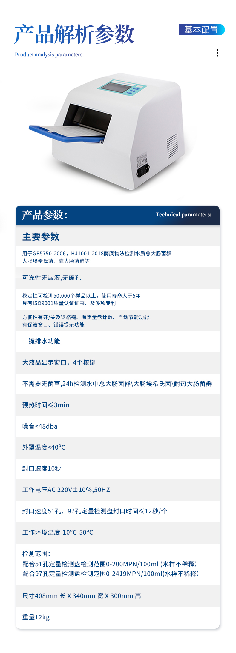 | 13、封口速度:51孔、97孔定量检测盘封口时间≤12秒/个 | 14、工作环境温度-10ºC-50ºC | 15、检测范围:配合51孔定量检测盘0-200MPN/100ml;配合97孔定量检测盘0-2419MPN/100ml(水样不稀释) | 16、尺寸408mm 长 X 340mm 宽 X 300mm 高 |