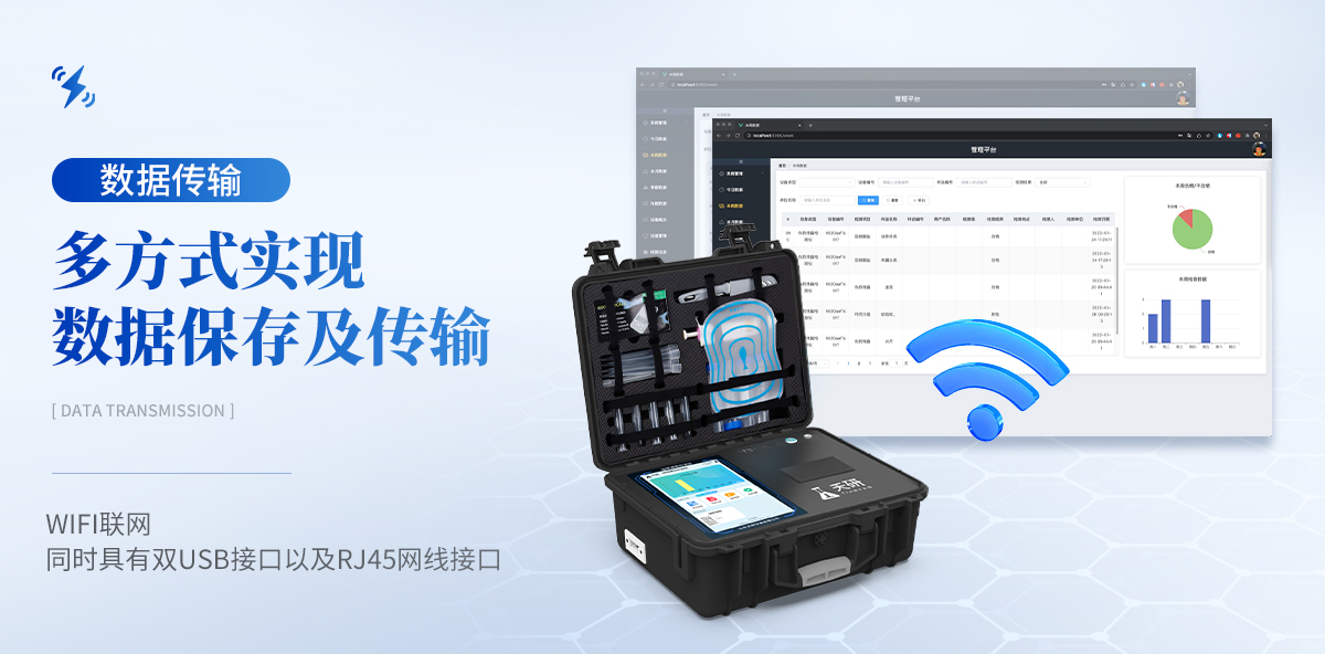 11、仪器具有 wifi 联网上传、RJ45网线连接功能,可以快速上传数据。同步对接监管平台,数据可局域网和互联网数据上传,检测结果直接传至食品安全监管平台。进行区域食品安全监管及大数据分析处理与数据统计,检测区域食品安全长短期动态,达到食品安全问题预估、预警。