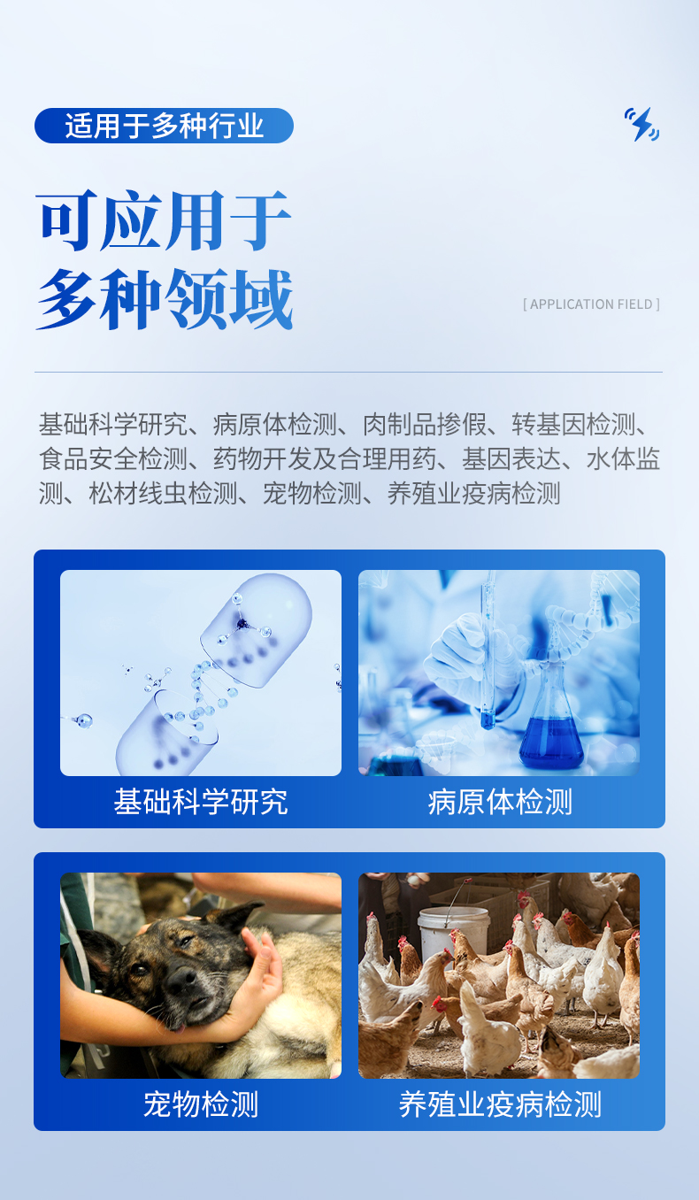 基础科学研究、病原体检测、宠物检测、养殖业疫病检测(牛羊、鸡鸭鹅等禽类、鱼虾等水产)