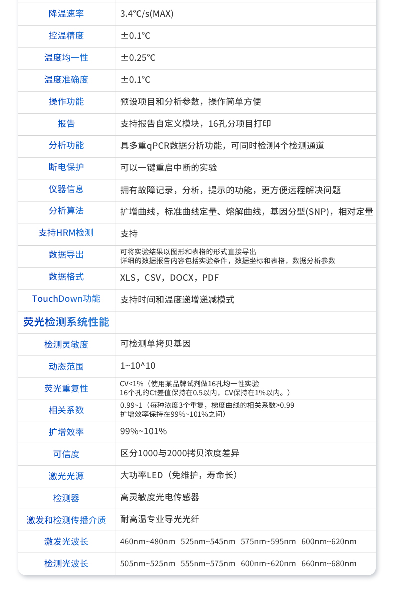 | 分析功能 | 具多重qPCR数据分析功能,可同时检测4个检测通道 | |