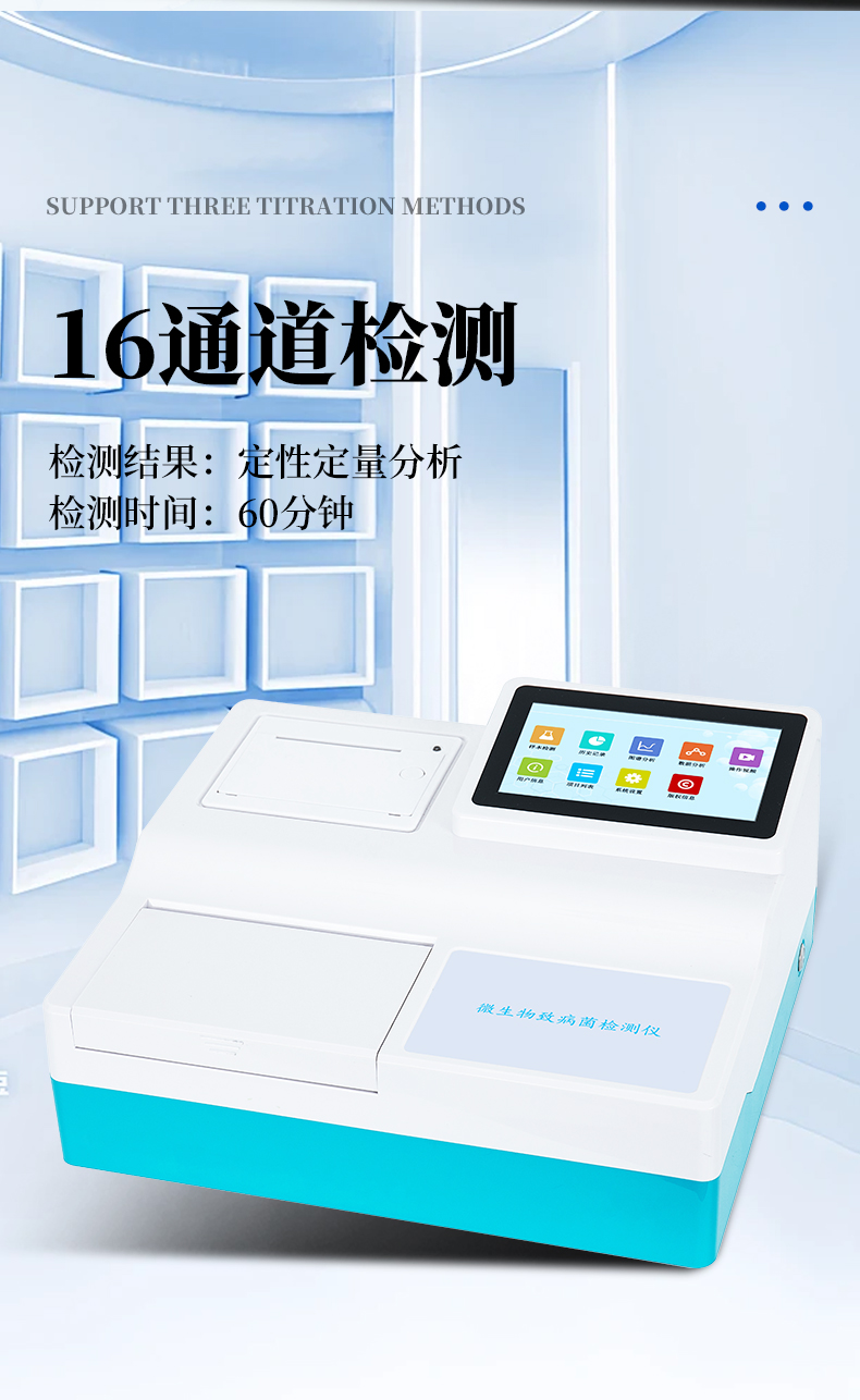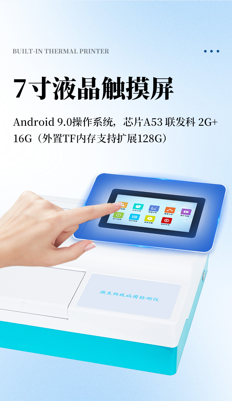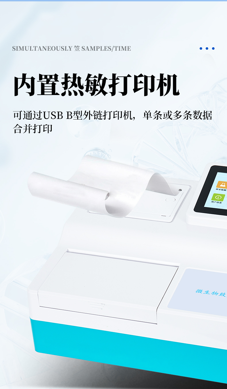 | 11. 打印功能 | 内置热敏打印机,可通过USB B型外链打印机,单条或多条数据合并打印,可打印检测结果检测报告可打印检测项目、样品名称、检测结果、结果判断、检测日期 、检测单位、检验人员、被检测单位等信息;USB B型接口可连接A4打印机打印结果。 |