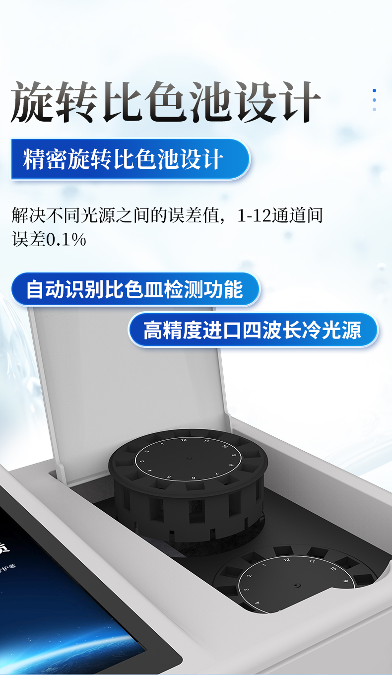 | 4. 检测通道 | ≥24通道;采用精密旋转比色池设计,使用同芯片同光源校准精度,1-24通道间误差0.1%。(专利号:ZL202022821055.2) |