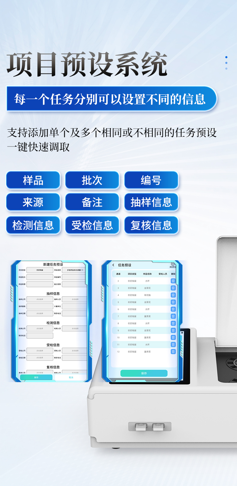 | 9.5 项目预设系统 | 仪器具有任务预设模块,一键提前预设,给出方便快捷的新检测方案。 |