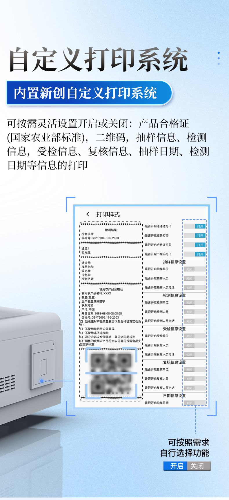 | 9.7.1 打印系统 | 内置全新打印机,新创自定义打印方式,可按需灵活勾选控制打印内容,包括产品合格证、二维码、抽样信息、检测信息等。 |