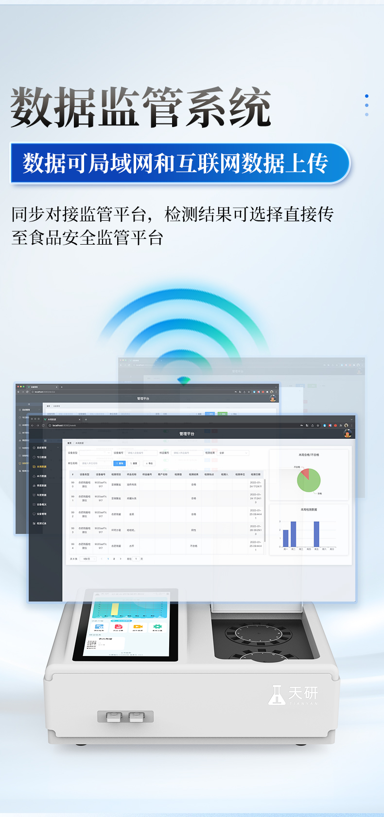 | 9.6 数据监管系统 | 同步对接监管平台,数据可局域网和互联网数据上传,检测结果可选择直接传至食品安全监管平台。 |