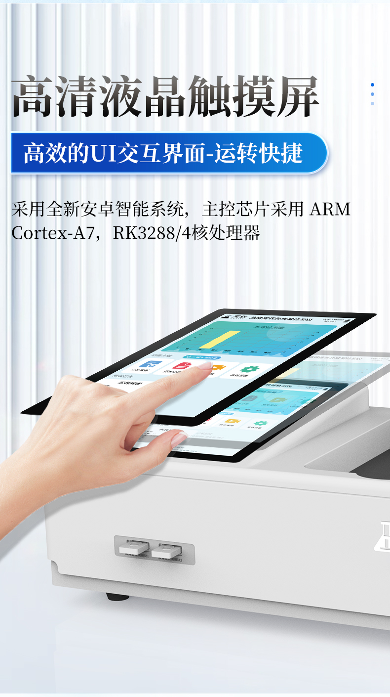 | 3. 显示与操作系统 | 仪器采用10.1英寸竖向液晶触摸屏显,搭配运行安卓智能操作系统,主控芯片采用RK3568 Cortex A55 四核64位处理器,**主频 2.0G。 |