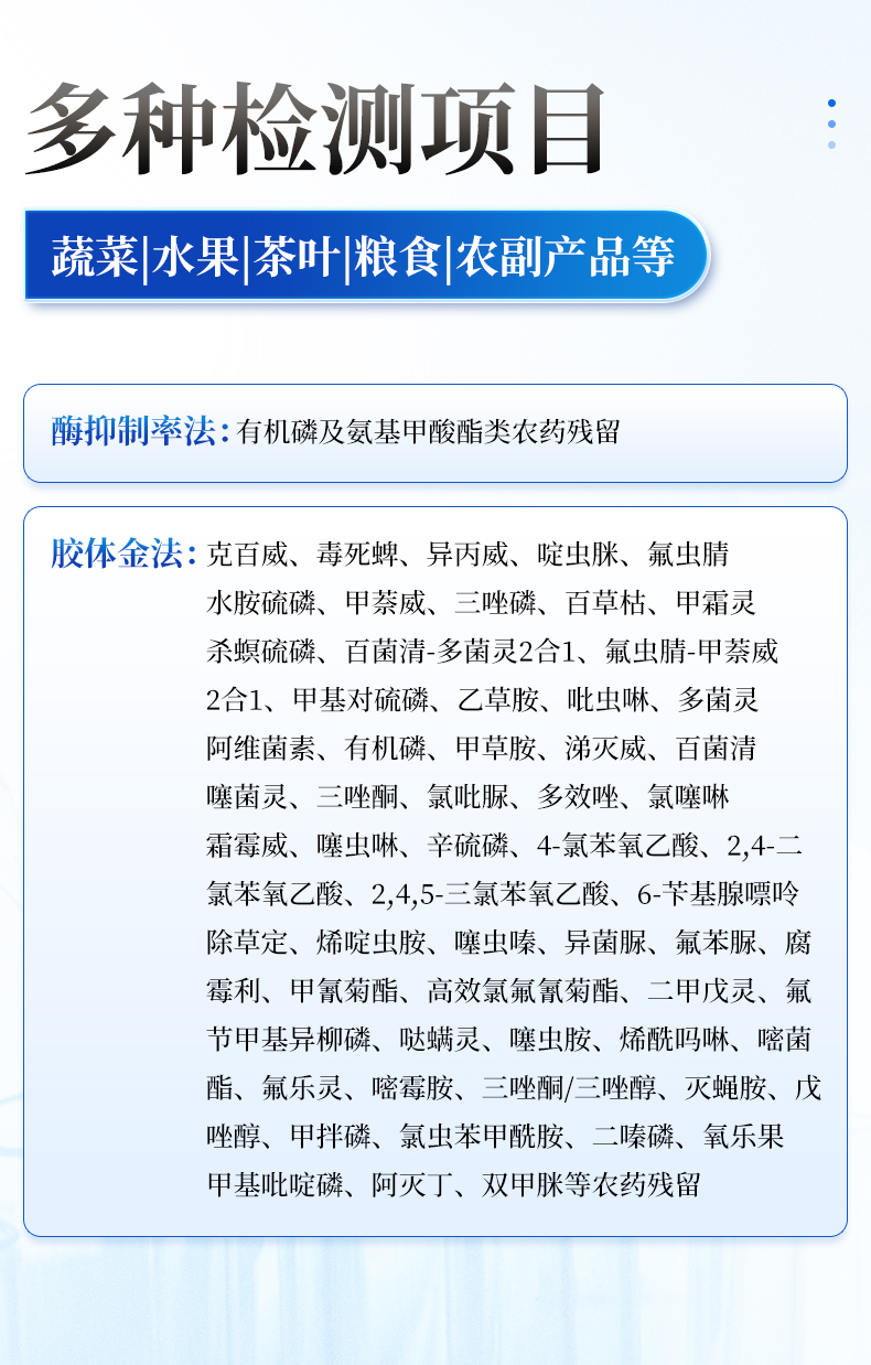 | 胶体金法 | 克百威、毒死蜱、异丙威、啶虫脒、氟虫腈、水胺硫磷、甲萘威、三唑磷、百草枯、甲霜灵、杀螟硫磷、百菌清-多菌灵2合1、氟虫腈-甲萘威2合1、甲基对硫磷、乙草胺、吡虫啉、多菌灵、阿维菌素、有机磷、甲草胺、涕灭威、百菌清、噻菌灵、三唑酮、氯吡脲、多效唑、氯噻啉、霜霉威、噻虫啉、辛硫磷、4-氯苯氧乙酸、2,4-二氯苯氧乙酸、2,4,5-三氯苯氧乙酸、6-苄基腺嘌呤、除草定、烯啶虫胺、噻虫嗪、异菌脲、氟苯脲、腐霉利、甲氰菊酯、**氯氟氰菊酯、二甲戊灵、氟节甲基异柳磷、哒螨灵、噻虫胺、烯酰吗啉、嘧菌酯、氟乐灵、嘧霉胺、三唑酮/三唑醇、灭蝇胺、戊唑醇、甲拌磷、氯虫苯甲酰胺、二嗪磷、氧乐果、甲基吡啶磷、阿灭丁、双甲脒等农药残留 |