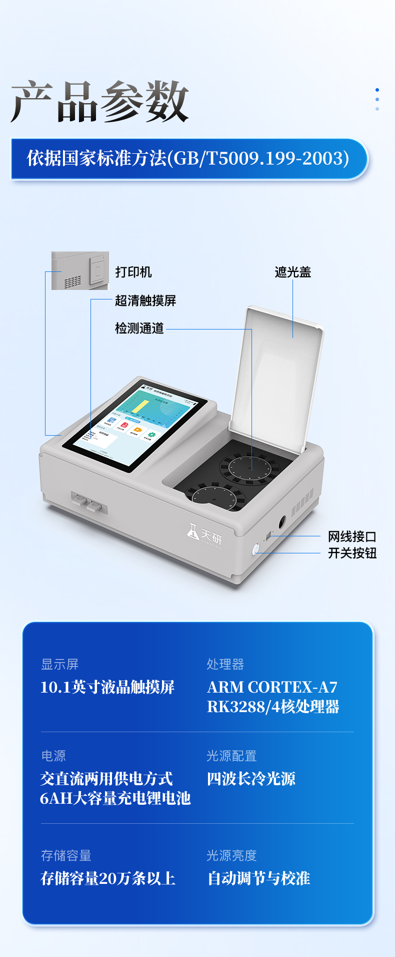 | 8. 数据存储与导出 | 支持U盘存储,检测结果存储容量20万条以上,可生成Excel表格进行拷贝。 |