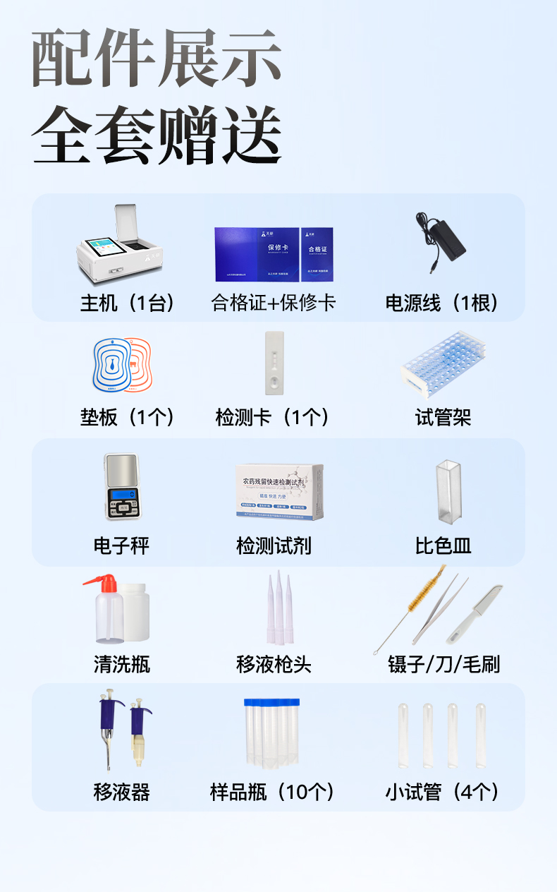 高智能农药残留检测仪,除了遵循国标对有机磷和氨基甲酸酯类农药进行检测外,还可以针对具体农药进行分项准确检测(具体分类见项目表),检测方法:有机磷和氨基甲酸酯类农药检测采用酶抑制率比色法,依据国家标准方法(GB/T5009.199-2003)。乙酰胆碱酯酶和丁酰胆碱酯酶试剂均可以使用,符合