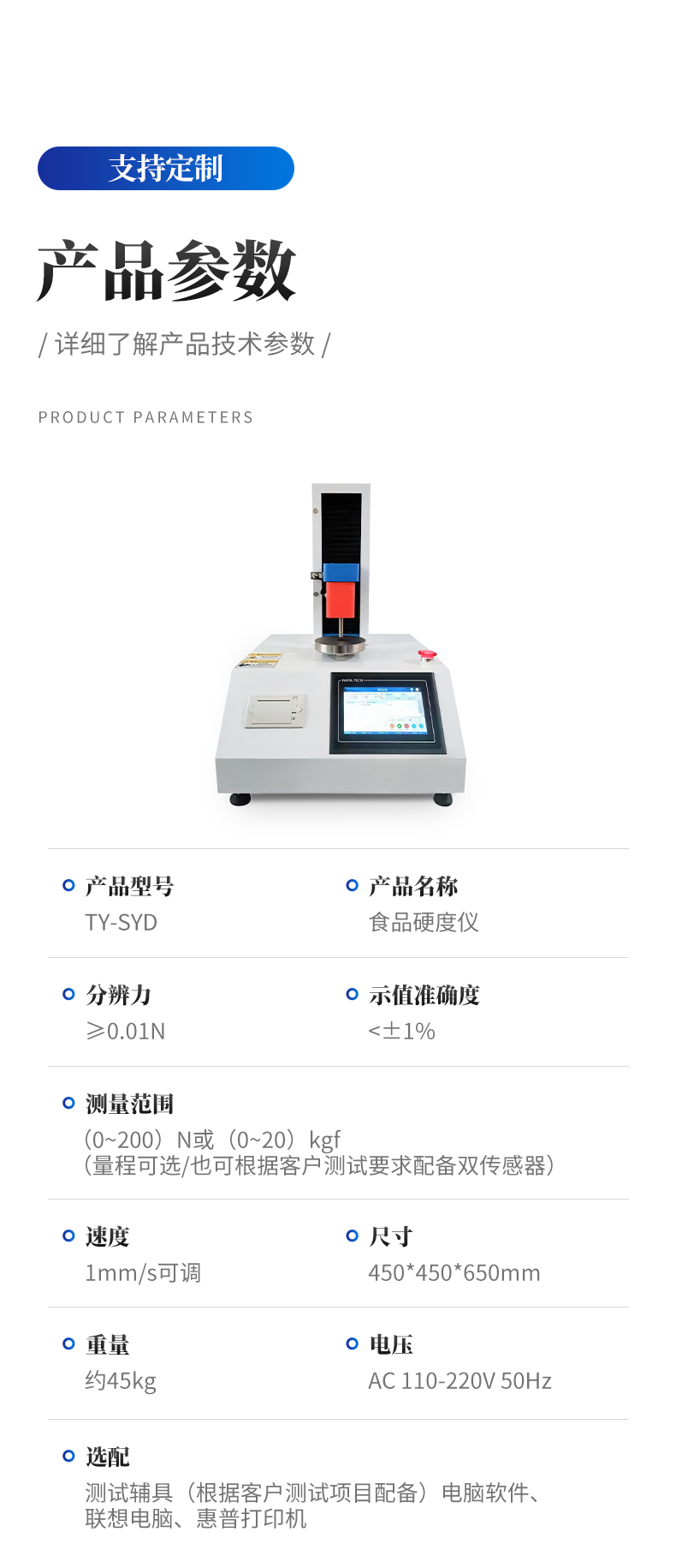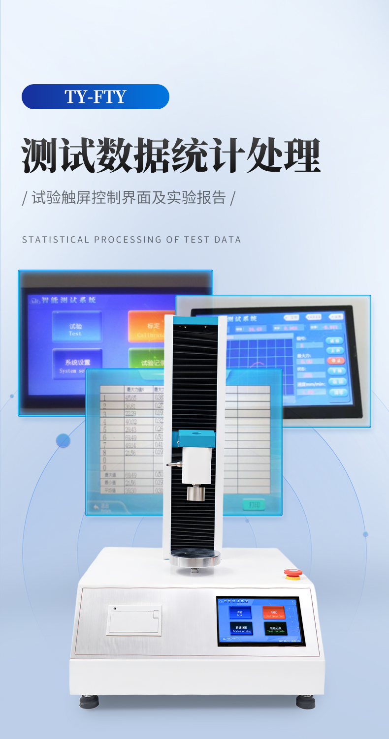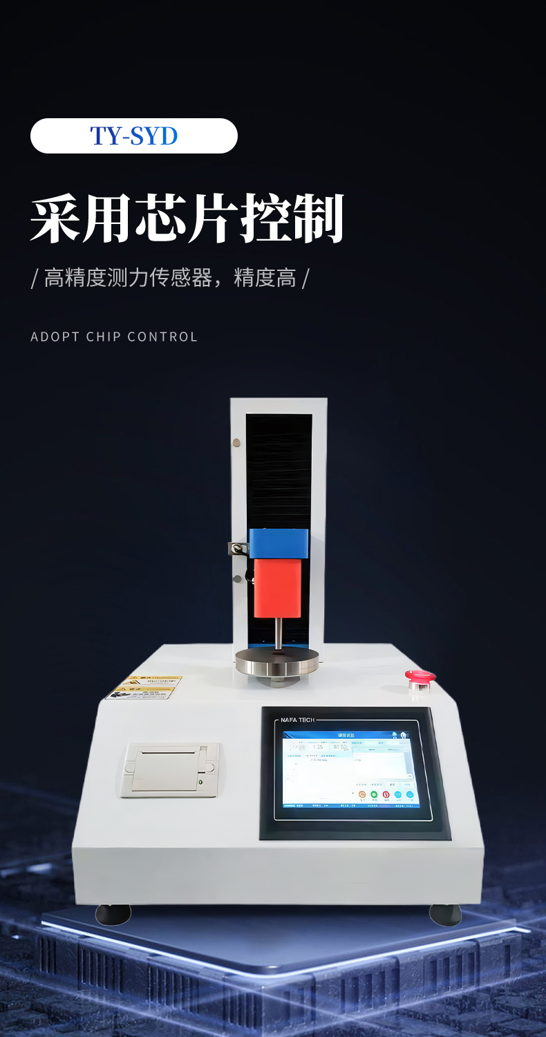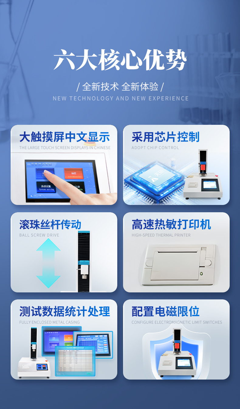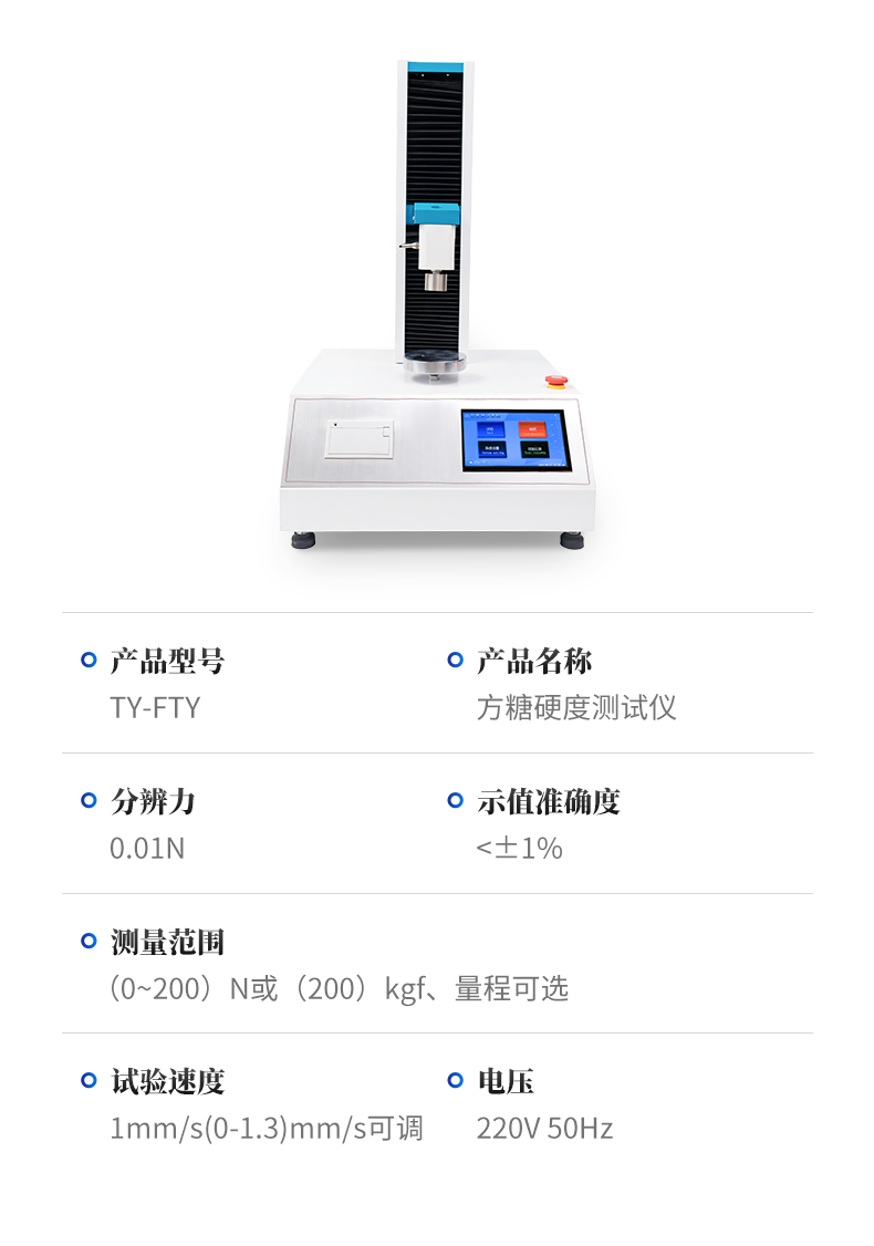 1、采用芯片控制,搭配高精度测力传感器,检测精度高。 2、采用高性能电机,滚珠丝杆传动,设备传动稳定可靠。 3、配备大触摸屏,支持中文/英文双语切换显示,人机界面友好,可全自动完成测试,具备测试数据统计处理功能,操作便捷。 4、上下限位可自由移动,采用电磁感应法限位原理,限位精准灵敏。 5、大触摸彩色屏显示,支持菜单操作与测试过程曲线实时显示。 6、刀具、测试压头、砧床等测试辅具均采用不锈钢材质,耐用不生锈。 7、搭载专业测控软件,测试全过程自动化,无需手动运算;放入试样后按下测试键,自动下压、自动判定试验完成、自动回升至初始位置。 8、软件支持终身免费升级。 9、触摸屏款设备支持测试数据导出,使用方便快捷。 10、内置随机内嵌式高速热敏打印机,可实时打印单组结果或整组试验查询后批量打印。 11、配备电磁限位、急停按钮、过载保护等多重安全保护装置。 12、减速电机经同步轮驱动精密滚珠丝杠,传动精准、运行静音。 13、整机采用加厚一体式工作台面与加厚上横梁,结构稳固、外观美观、经久耐用。 |