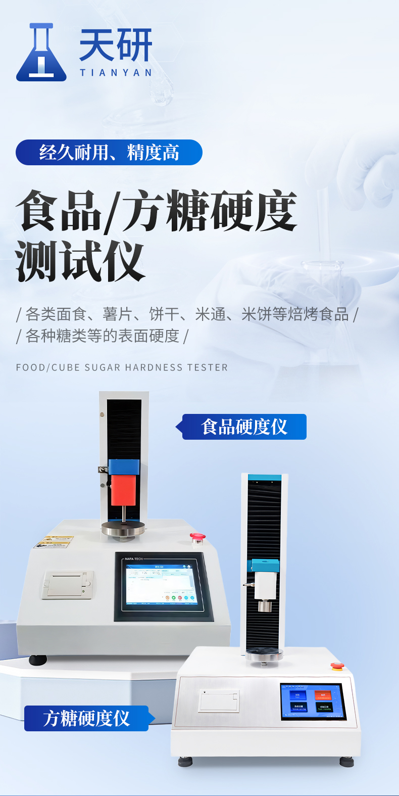 食品硬度仪适用于各类面食、薯片、饼干、米通、米饼等焙烤食品物性测定,可完成饼干破裂强度测定、食品咀嚼性测定、饼干酥脆性测定、面包硬度测定、糖果硬度测定、果冻破裂强度测定等各类休闲食品物性检测。