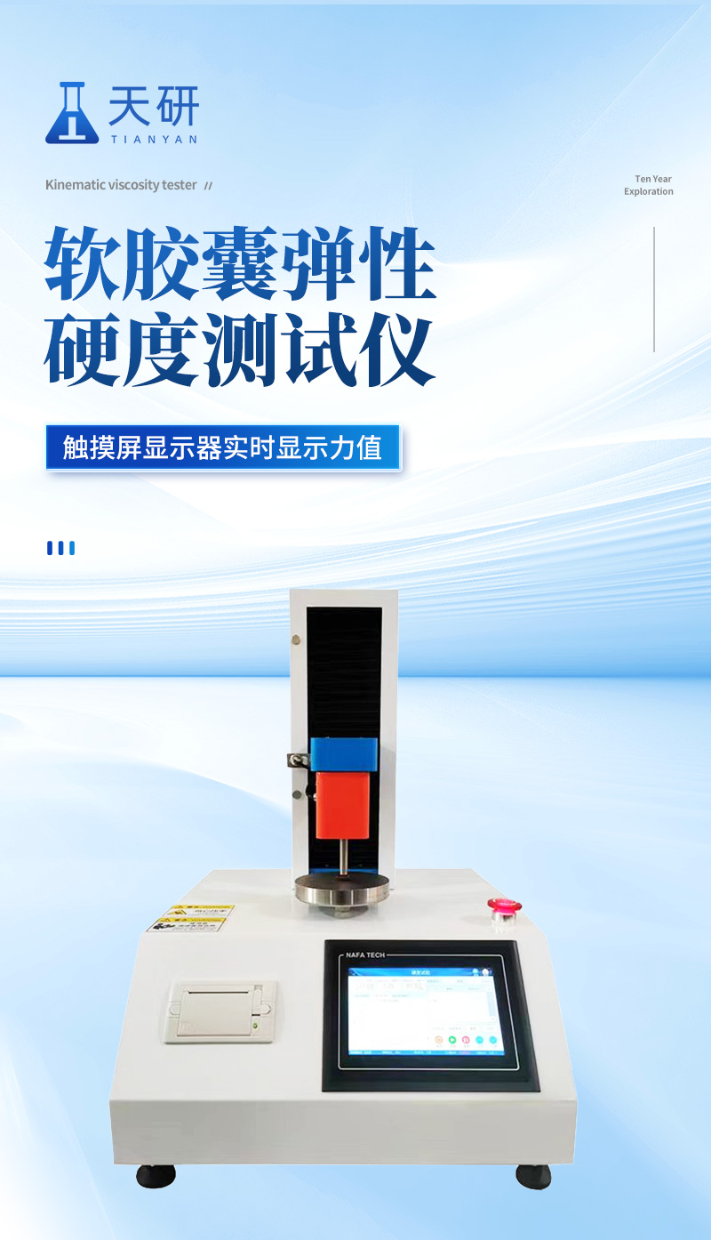 产品名称: 天研仪器 软胶囊弹性(硬度)测试仪 产品介绍: 软胶囊弹性(硬度)测试仪适用于测定各类软胶囊的硬度、弹性等物性指标,为产品配方优化与工艺制定提供精准参考数据。仪器别名:软胶囊硬度测定仪、软胶囊弹性测定仪。 测试原理: 通过下压测试测定软胶囊在不