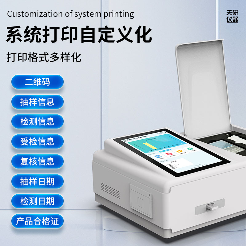 | 1、仪器采用10.1英寸液晶触摸屏,搭载安卓智能操作系统,主控芯片为RK3568 Cortex A55 四核64位处理器,**主频2.0G,运转速度快、性能强劲。 2、集成胶体金检测模块、数字化管理模块、无线通讯模块等,同一软件可完成所有检测项目,同一窗口展示检测结果。 3、一体化台式快检设备,交直流两用供电,可连接车载电源,配备6ah大容量充电锂电池,满足现场及流动检测需求。 4、自带数据集成模块,首页自动统计周/月检测数据、总检测数、合格数、不合格数,配套柱形分析图,直观快捷。 5、具备任务预设模块,送检前预设样品名称、检测指标、送检单位等信息,送检时一键调取,检测**便捷。 6、胶体金检测模块:直插式自动扫描,实时显示金标卡图像,自动分析CT曲线图、自动识别CT线,无需手动调整,检测后自动退卡;结果判定线可修改,对照值标定值断电不丢失;兼容市面主流胶体金卡,耗材不受限。 7、图像调整功能:可对金标卡读取图像多方位调整,提升结果读取精准度。 8、检测系统搭载大容量数据库,具备完善检索、修订功能;食品库可增删编辑样品名,产品库与历史记录支持一键检索。 9、自定义打印系统,支持打印国家标准合格证、二维码、抽样信息、检测信息、受检信息、复核信息、抽样日期、检测日期等内容。 10、A4纸报告打印功能:支持A4版与小票版两种报告模板,可通过WiFi、网线连接外置打印机打印。 11、支持WiFi联网、RJ45网线连接,数据可快速上传,同步对接食品安全监管平台,支持局域网/互联网上传,实现区域监管、大数据分析与安全预警。 12、支持U盘存储,标准USB接口免驱动,数据存储容量20万条以上,可生成Excel表格一键拷贝;具备登录保护,可设置用户密码与操作权限,支持重新校准、锁定、恢复出厂设置,固件可升级、检测项目可扩充。 13、支持远程升级,可分客户、分仪器定向更新,开机自动升级,系统版本可持续免费更新,无需返厂,降低成本与设备损坏风险。 |